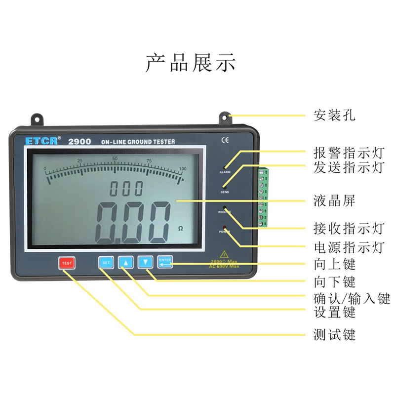 ETCR2900B在線接地電阻測試儀帶有LCD顯示,可在現(xiàn)場查看接地電阻值,可以通過儀表按鍵設(shè)置報警臨界值,可設(shè)置監(jiān)測間隔時間,并具有聲光報警指示。