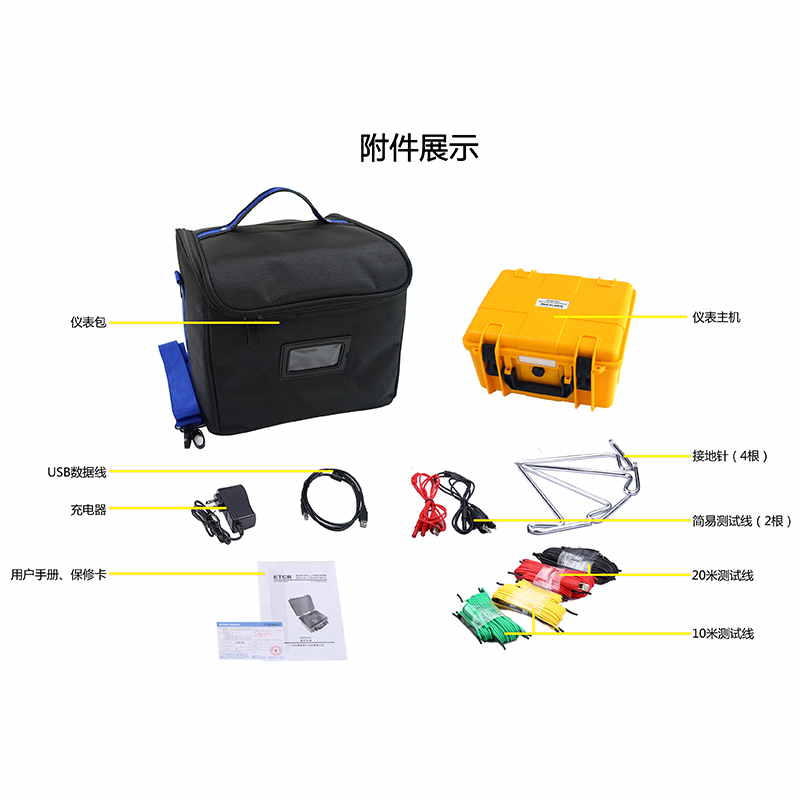 ETCR3100C接地電阻/土壤電阻率測(cè)試儀由主機(jī)、數(shù)據(jù)上傳軟件、測(cè)試線、輔助接地棒、通訊線等組成。儀表外殼采用防水保護(hù)箱,防撞、防摔、防水(防護(hù)等級(jí)IP65)堅(jiān)固安全耐用,儀表還配有大容量可充電鋰電池組,特別適合在戶外工地使用。主機(jī)超大LCD顯示,白屏背光,棒圖指示,一目了然。藍(lán)牙通訊功能,數(shù)據(jù)存儲(chǔ)功能存儲(chǔ)300組數(shù)據(jù),通過(guò)USB接口數(shù)據(jù)上傳軟件實(shí)現(xiàn)歷史查詢與在線實(shí)時(shí)監(jiān)測(cè)功能,動(dòng)態(tài)顯示,告警指示,具有歷史數(shù)據(jù)讀取、查閱、保存、報(bào)表、打印等功能。