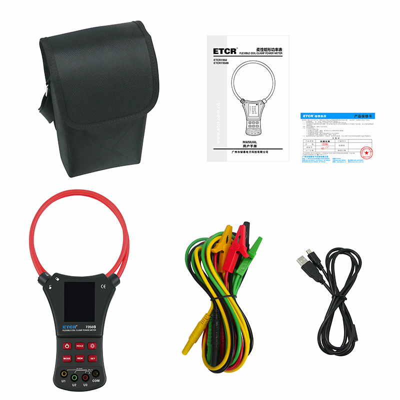 ETCR7350B柔性鉗形功率表又名羅氏線圈功率表、洛氏線圈功率表,用于現(xiàn)場測量三相交流電壓、電流、電壓間相位、電壓電流間相位、頻率、相序、電能、有功功率、無功功率、視在功率、功率因數(shù)、總功率等電能參數(shù)。還能用于判別變壓器接線組別、感性、容性電路,讀出差動保護(hù)各組CT之間的相位關(guān)系,檢查電度表的接線正確與否,檢修線路設(shè)備等,為用電檢查人員提供一種安全、準(zhǔn)確、便捷的新型電力儀表。