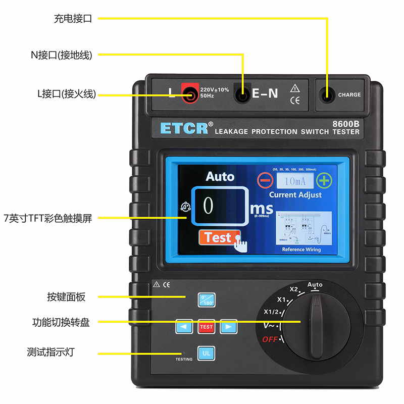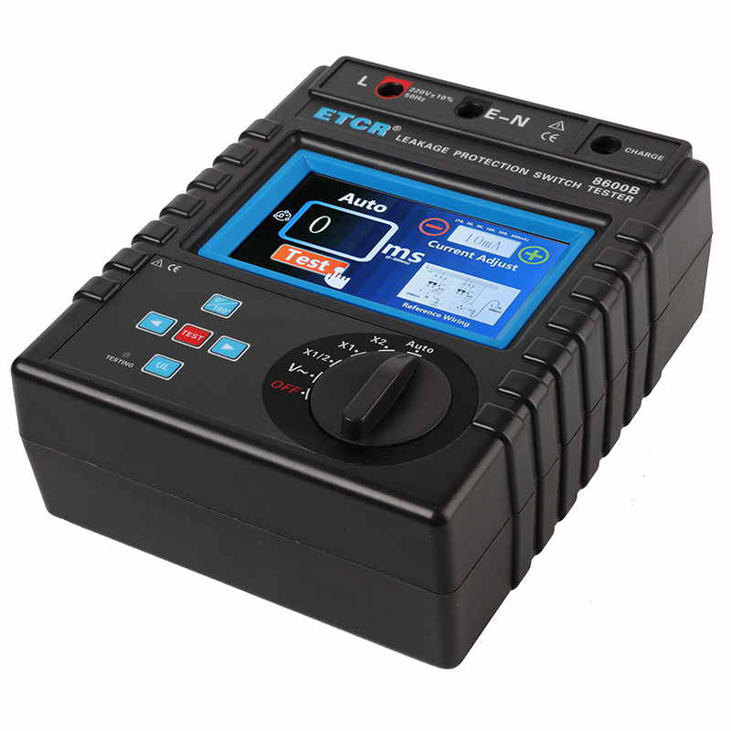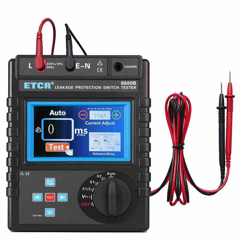 ETCR8600B漏電保護(hù)器測(cè)試儀又稱(chēng)漏電開(kāi)關(guān)測(cè)試儀、漏電開(kāi)關(guān)特性測(cè)試儀,用于現(xiàn)場(chǎng)在線(xiàn)測(cè)試各種漏電保護(hù)器的漏電動(dòng)作時(shí)間、以及線(xiàn)路交流電壓。測(cè)試電流從5mA~1000mA分16檔(5mA、10mA、15mA、20mA、30mA、40mA、50mA、60mA、100mA、150mA、200mA、250mA、300mA、500mA、600mA、1000mA),測(cè)試漏電流動(dòng)作時(shí)間量程為0~999ms。交流電壓量程:0~600V。