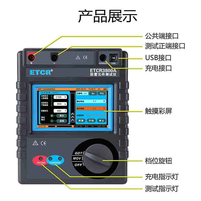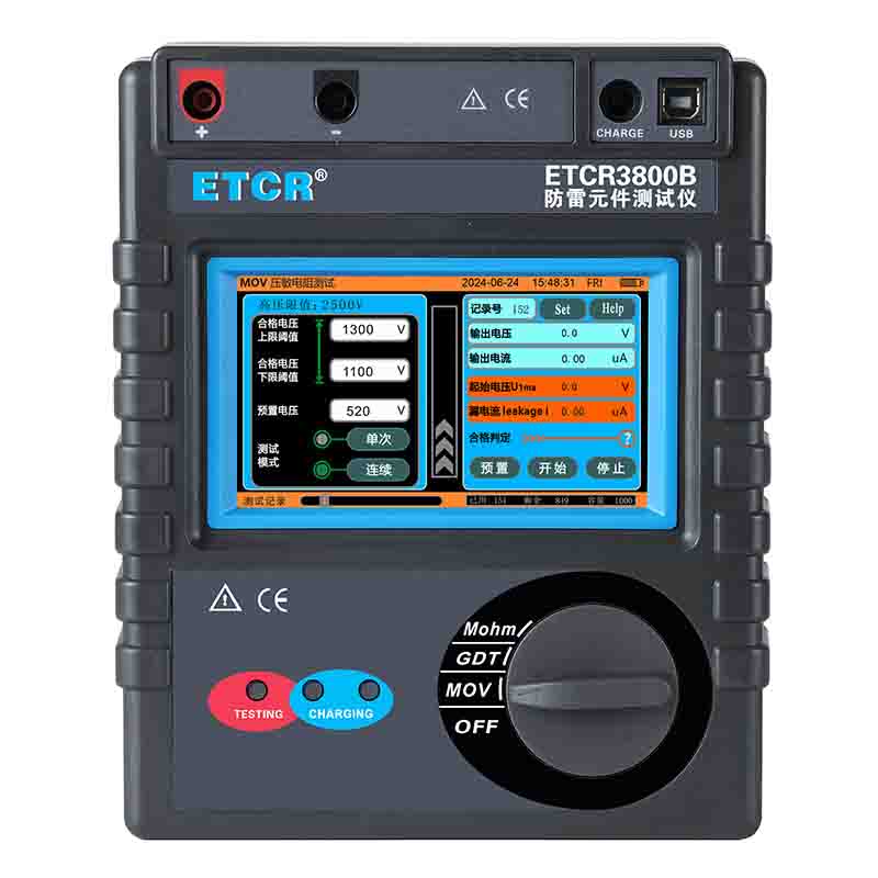 ETCR3800A智能型防雷元件測(cè)試儀又稱防雷元件測(cè)試表、SPD現(xiàn)場(chǎng)測(cè)試儀、壓敏電阻測(cè)試儀、浪涌保護(hù)器測(cè)試儀,用于測(cè)量各種壓敏電阻(MOV)、氣體放電管(GDT)、浪涌保護(hù)器(SPD)性能參數(shù)測(cè)試,儀表具有獨(dú)特的高壓短路保護(hù)、過(guò)流保護(hù)功能,專業(yè)級(jí)的參數(shù)設(shè)置功能、高壓限值設(shè)定、升壓速度設(shè)定、合格范圍設(shè)定、合格判斷篩選、自動(dòng)量程調(diào)節(jié)等功能。還具有單件測(cè)試模式、連續(xù)測(cè)試模式功能,特別適合批量元件測(cè)試。儀器廣泛用于避雷器、防雷器、浪涌保護(hù)器、壓敏電阻、金屬陶瓷放電管、真空避雷管等過(guò)壓防護(hù)元件性能參數(shù)的測(cè)試。是氣象防雷、電力、通信、機(jī)電安裝和維修、防雷元件生產(chǎn)廠家、以及工業(yè)企業(yè)部門常用必備的儀表。