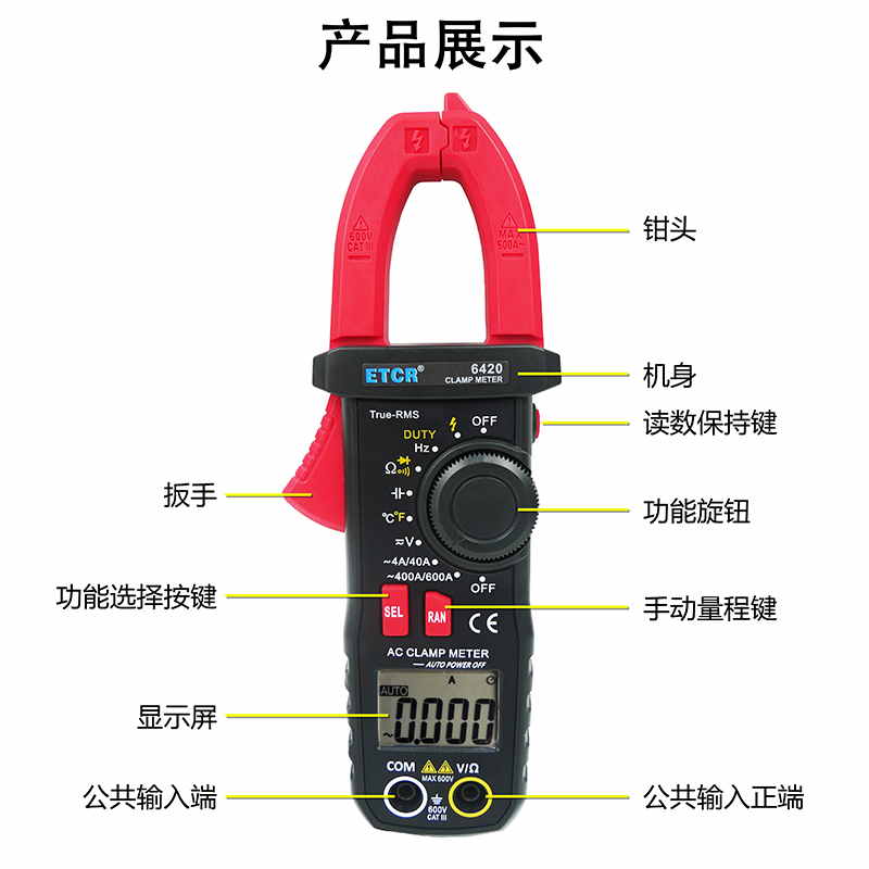 ETCR6420鉗形萬用表又稱多功能鉗形電流表,是一種便攜式鉗形數(shù)字多用表,可測量直流電壓、交流電壓電流真有效值、電阻、頻率、通斷測試、溫度、二極管正向壓降等參數(shù),電容測量量程擴大到10mF且測量大電容速度快。該儀表結構小巧、操作容易、攜帶方便,是電氣測量之理想工具。為用電檢查人員提供一種安全、準確、便捷的新型電力儀表,是電工安全檢測的必備工具。