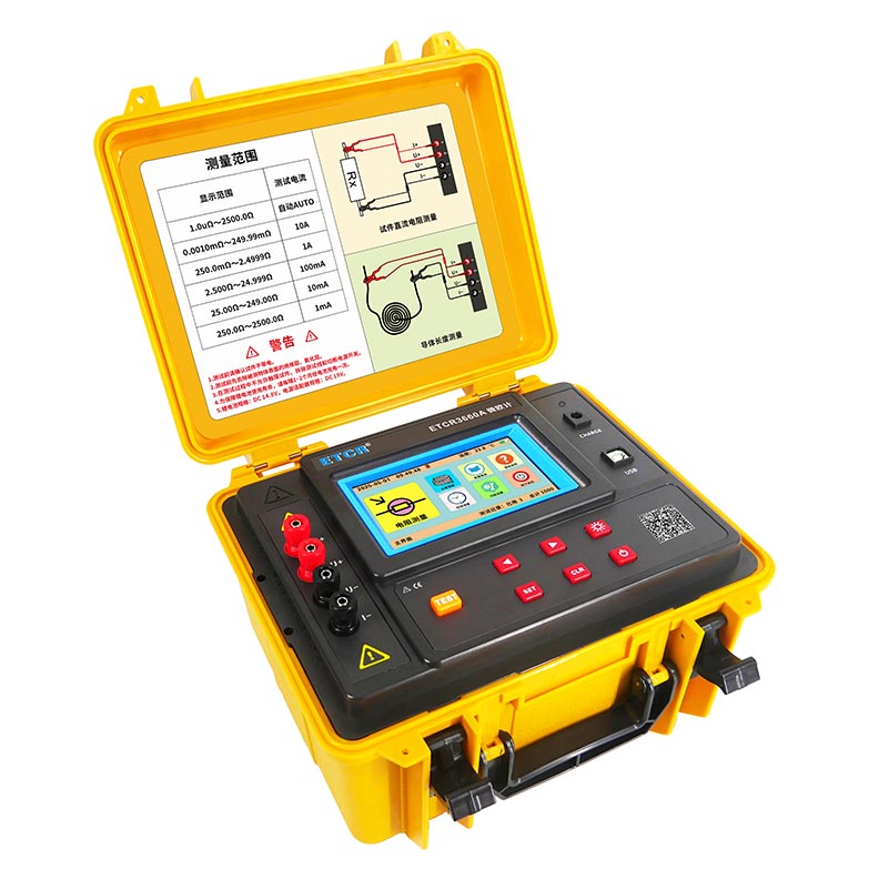 ETCR3660A微歐計(jì)又稱直流電阻測試儀、直流低值電阻測試儀,儀表采用微處理機(jī)技術(shù),精密四線法測試,準(zhǔn)確可靠。主要用于測量小型變壓器繞組電阻;接地導(dǎo)通電阻;電纜導(dǎo)線電阻;開關(guān)、接插件、繼電器的接觸電阻;金屬鉚接電阻;線圈、電動(dòng)機(jī)、互感器繞組電阻;金屬構(gòu)件之間聯(lián)結(jié)電阻;電焊接點(diǎn)電阻;蓄電池并聯(lián)連接電阻;以及導(dǎo)線長度測量計(jì)算等。儀表外殼采用防水保護(hù)箱,防撞、防摔、防水(防護(hù)等級(jí)IP65)堅(jiān)固安全耐用,儀表還配有大容量可充電鋰電池組,特別適合在戶外工地使用。廣泛應(yīng)用于建筑質(zhì)檢站、監(jiān)理公司、建筑施工單位、防雷公司、電力部門、船舶機(jī)車廠等。