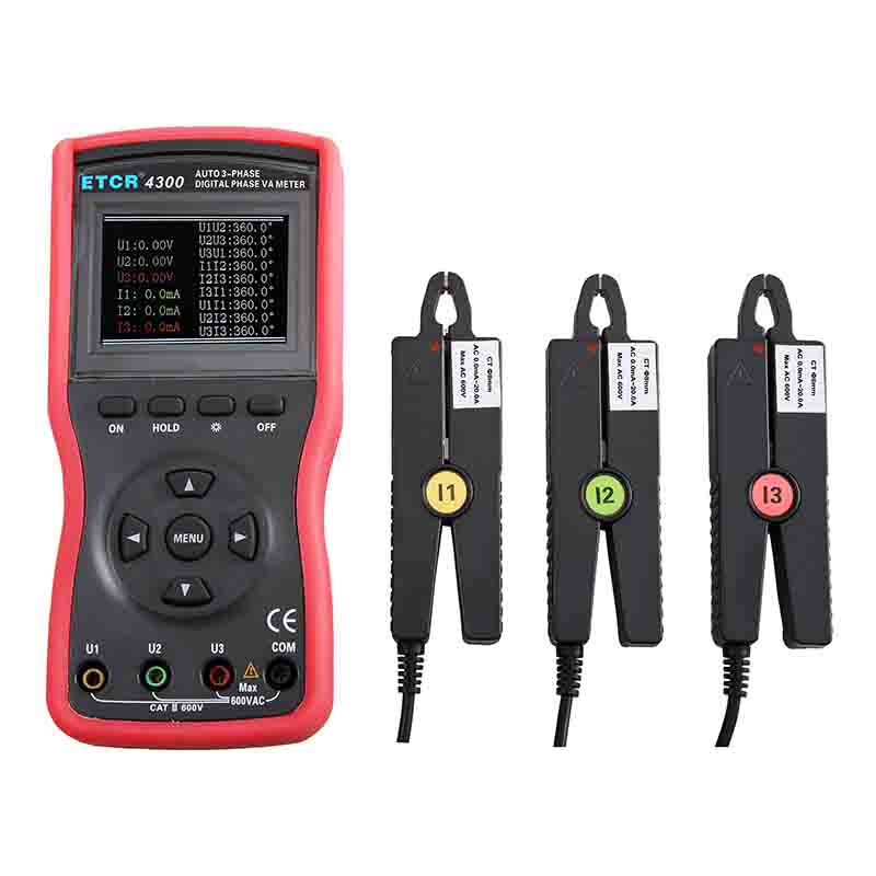 ETCR4300三相數字相位伏安表又稱三鉗相位伏安表、三相相位伏安測試儀、手持式相位測試儀、便攜式相位表 、矢量圖分析儀,用于同時測量三相交流電壓、電流、電壓間相位、電流間相位、電壓電流間相位、頻率、相序、有功功率、無功功率、視在功率、功率因數、電流矢量和,判別變壓器接線組別、感性、容性電路,測試二次回路和母差保護系統,讀出差動保護各組CT之間的相位關系,檢查電度表的接線正確與否,檢修線路設備等,為用電檢查人員提供一種安全、準確、便捷的新型電力儀表。尤其適用于電能計費系統及繼電保護系統。