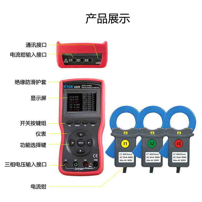 ETCR4320大口徑三相數(shù)字相位伏安表又稱三鉗相位伏安表、三相相位伏安測(cè)試儀、手持式相位測(cè)試儀、便攜式相位表 、矢量圖分析儀,用于同時(shí)測(cè)量三相交流電壓、電流、電壓間相位、電流間相位、電壓電流間相位、頻率、相序、有功功率、無功功率、視在功率、功率因數(shù)、電流矢量和,判別變壓器接線組別、感性、容性電路,測(cè)試二次回路和母差保護(hù)系統(tǒng),讀出差動(dòng)保護(hù)各組CT之間的相位關(guān)系,檢查電度表的接線正確與否,檢修線路設(shè)備等,為用電檢查人員提供一種安全、準(zhǔn)確、便捷的新型電力儀表。尤其適用于電能計(jì)費(fèi)系統(tǒng)及繼電保護(hù)系統(tǒng)。