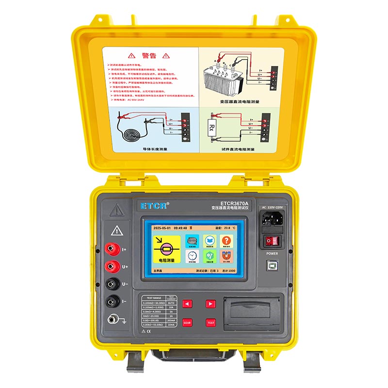 ETCR3670A變壓器直流電阻測試儀又稱變壓器繞組測試儀,直流電阻測試儀,用于快速測量各種變壓器繞組直流電阻。變壓器制造中半成品、成品出廠試驗、安裝、交接試驗及電力部門預(yù)防性試驗的必測項目,能有效發(fā)現(xiàn)變壓器線圈的選材、焊接、連接部位松動、缺股、斷線等制造缺陷和運行后存在的隱患。