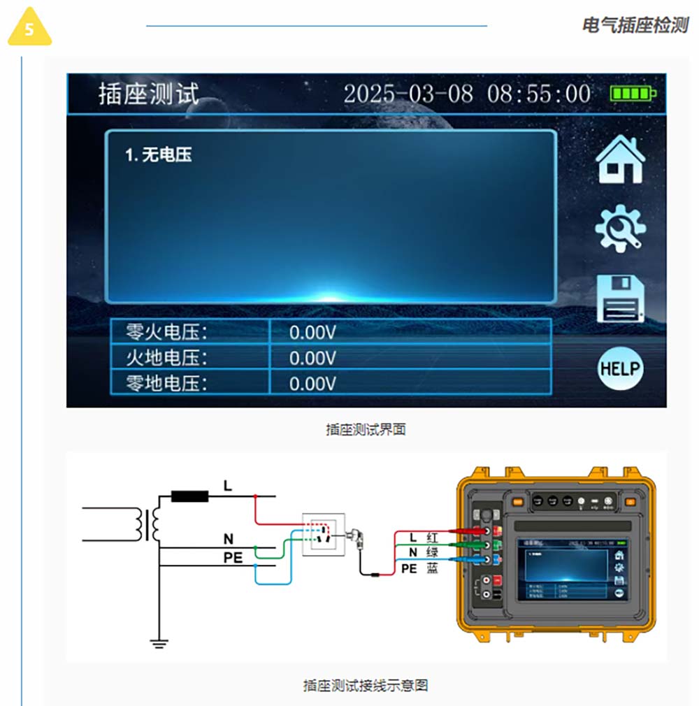 接地/絕緣/直流電阻測(cè)試、RCD漏電保護(hù)檢測(cè)、電氣插座檢測(cè)、電流有效值測(cè)試、交流電壓測(cè)試、相序測(cè)試等電力參數(shù)測(cè)試。